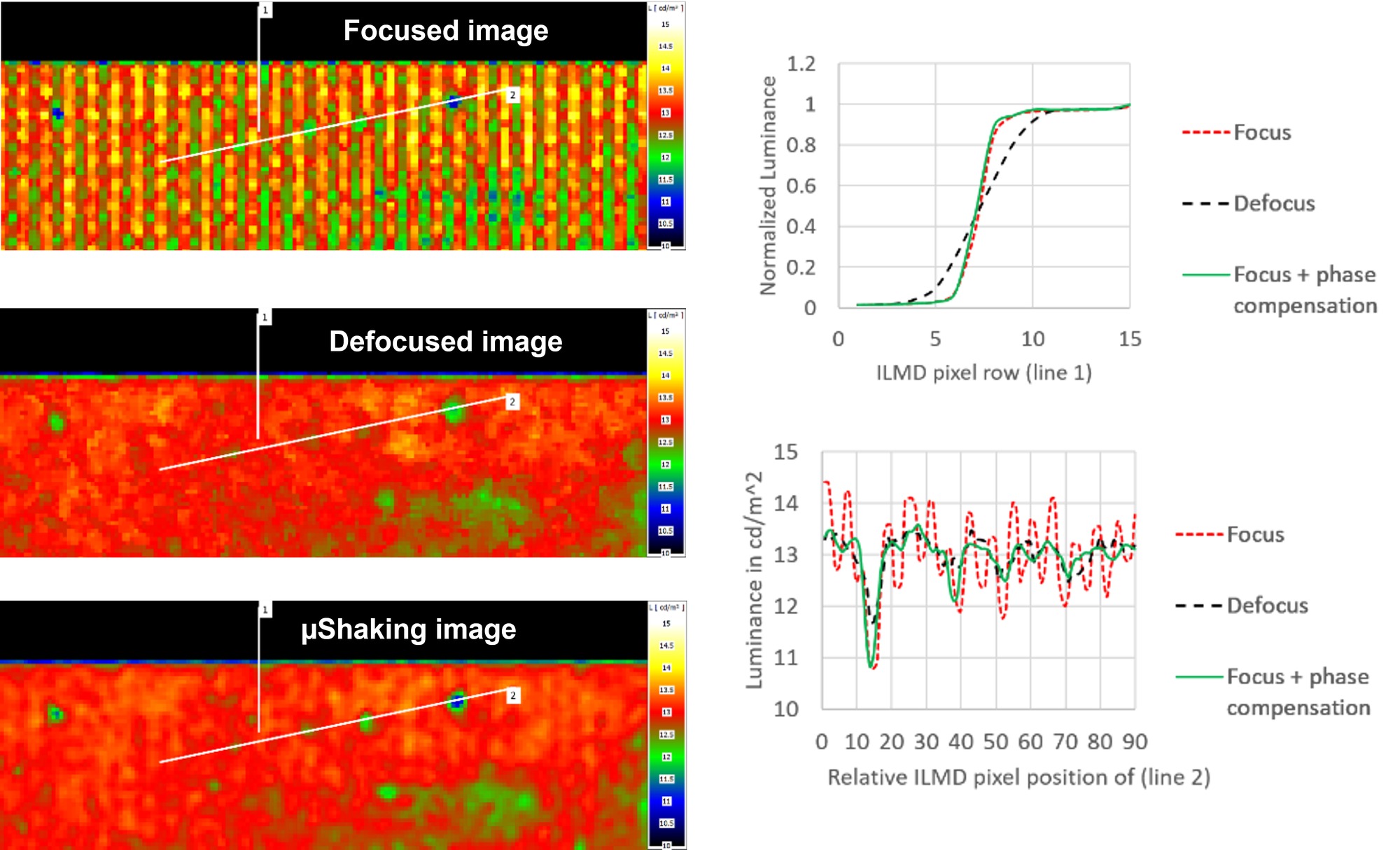 Left column: the same panel captured three ways — focused (Moiré clearly visible), defocused (Moiré suppressed, but fine detail smeared), µShaking (focus with phase compensation — Moiré suppressed, detail preserved). Right column: two quantitative verifications along the lines annotated in the captures. Top graph — normalised luminance across a sharp edge on line 1 — focused and µShaking track each other, the defocused curve flattens the edge. Bottom graph — luminance in cd/m² along line 2 in a nominally uniform area — the focused measurement shows the Moiré oscillation, the defocused measurement suppresses Moiré but also washes out the fine structure, and µShaking returns a flat profile at the expected luminance